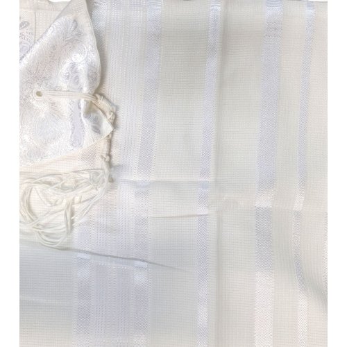 NEW! White on White Stripes! An impressive lightweight acrylic prayer shawl offering tradition and elegance. The perfect choice for a groom on his wedding day. The textured checkerboard weave, known as "tashbetz" – crossword, ensures that it is non-slip ensuring supreme comfort.