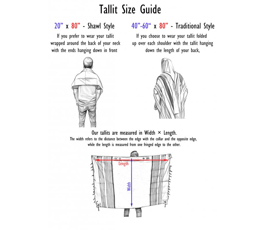 With this prayer shawl tallit you will receive a beautiful matching kippah and bag and a heavy duty plastic zippered tallit bag cover. Since each tallit is individually handwoven to order, please allow 4 weeks for preparation.