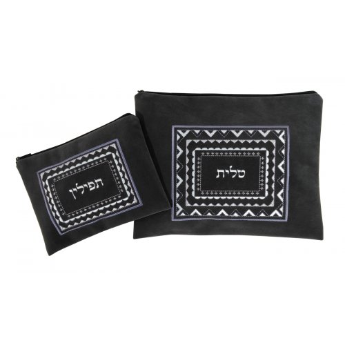 Impala Prayer Shawl Bag Set with Geometric Embroidered Design, Gray - Ronit Gur