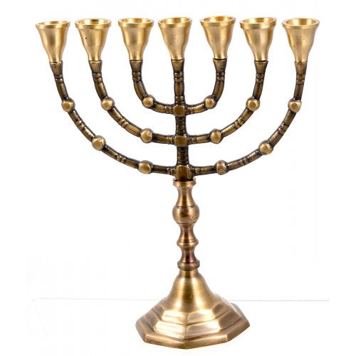 The antique look of this dark golden brass 7-branch menorah recall the menorah in the holy Temple. The spherical accents on the branches are artistic and will add a tasteful note to your home decor, blending with the curving base that stands on the hexagonal base.