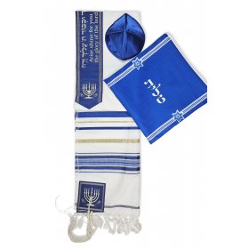 Acrylic Prayer Shawl Set with Menorah and Bible Words, Blue and Gold Stripes – Ateret$42.54 -
