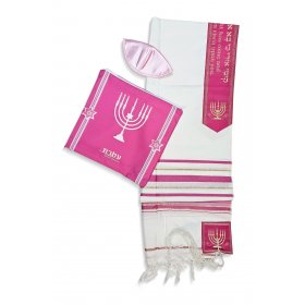 Acrylic Prayer Shawl Set with Menorah and Bible Words, Pink and Gold Stripes – Ateret$42.54 -