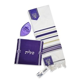 Acrylic Prayer Shawl Set with Menorah and Bible Words, Purple and Gold Stripes – Ateret$42.54 -